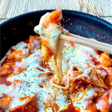 Add the tteokbokki to the boiling broth. Return to a boil and reduce to a low simmer, letting the rice cakes swell and cook for about 10-15 minutes. The stock will thicken around the cakes and become glossy and thick.