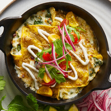 Drizzle the yogurt in a zigzag pattern from corner to corner. Carefully top the hot enchiladas with the arugula, Marinated Cherry Tomatoes, and red onion. Evenly sprinkle the cilantro over the enchiladas (not just in the center) and serve.