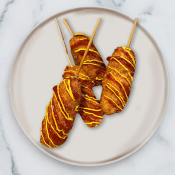 Garnish with a sprinkle of gochugaru and sugar, ketchup and mustard.