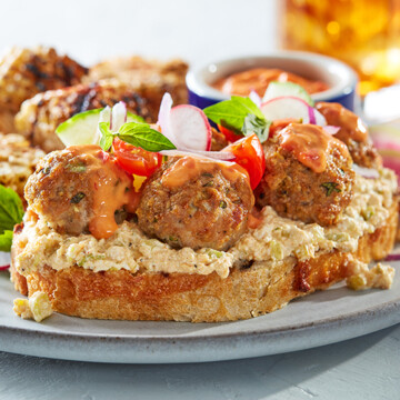To assemble sandwich, spread softened butter on both sides of one slice sourdough bread. Grill or toast until well browned and crisp. Spread one side with the curry cucumber farmer’s cheese spread. Top with five meatballs. Drizzle meatballs with harissa aioli. Arrange vegetable garnish over and around meatballs before serving.